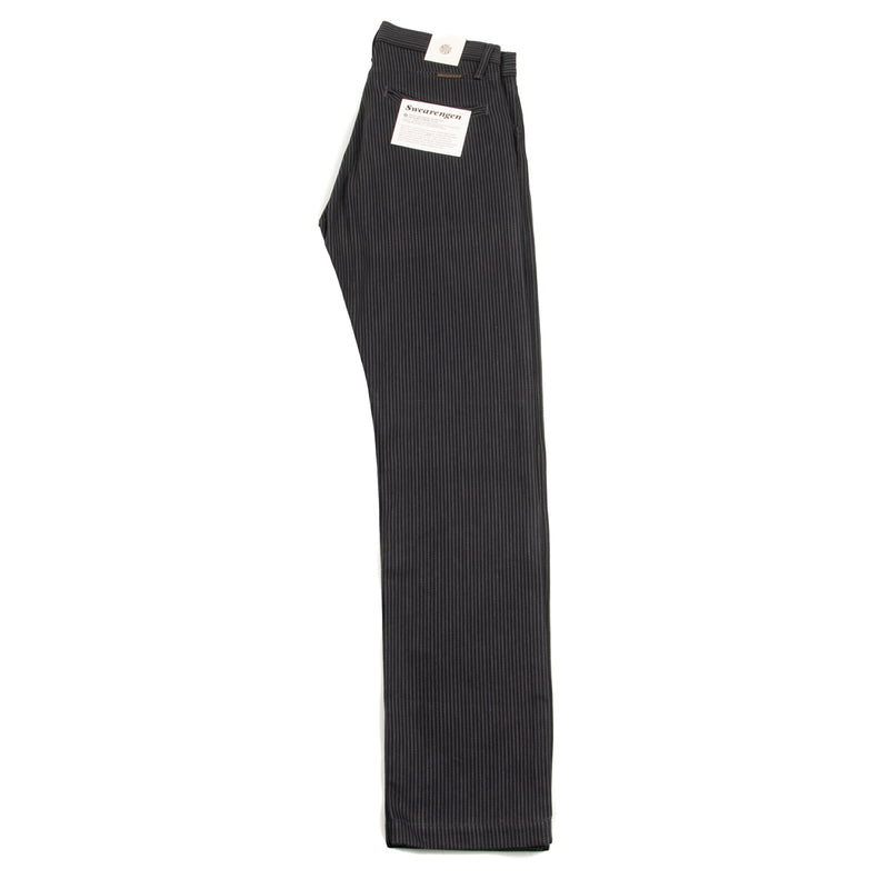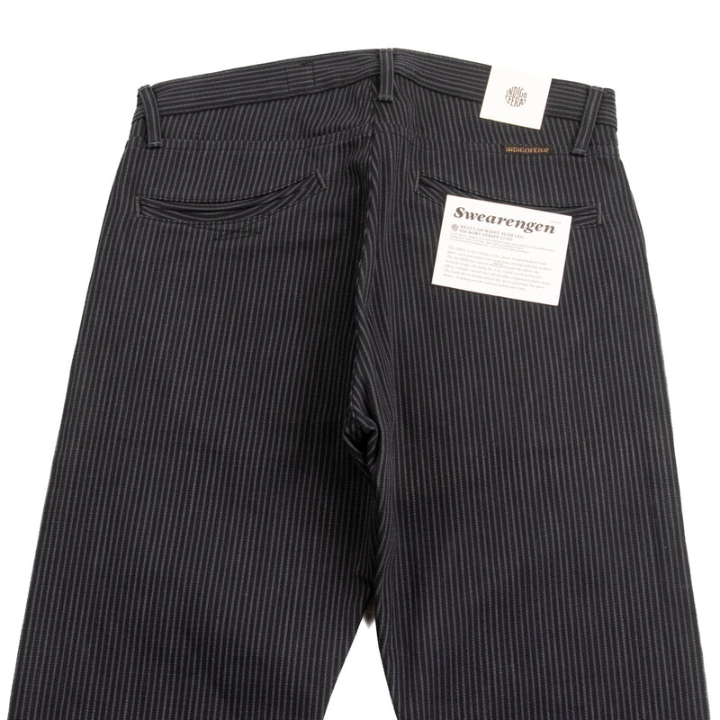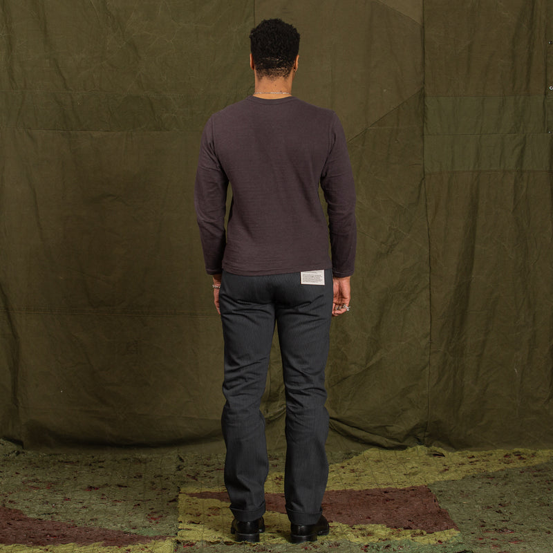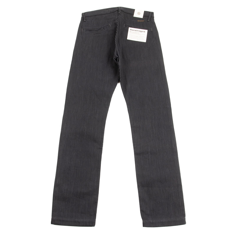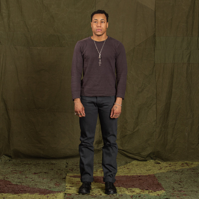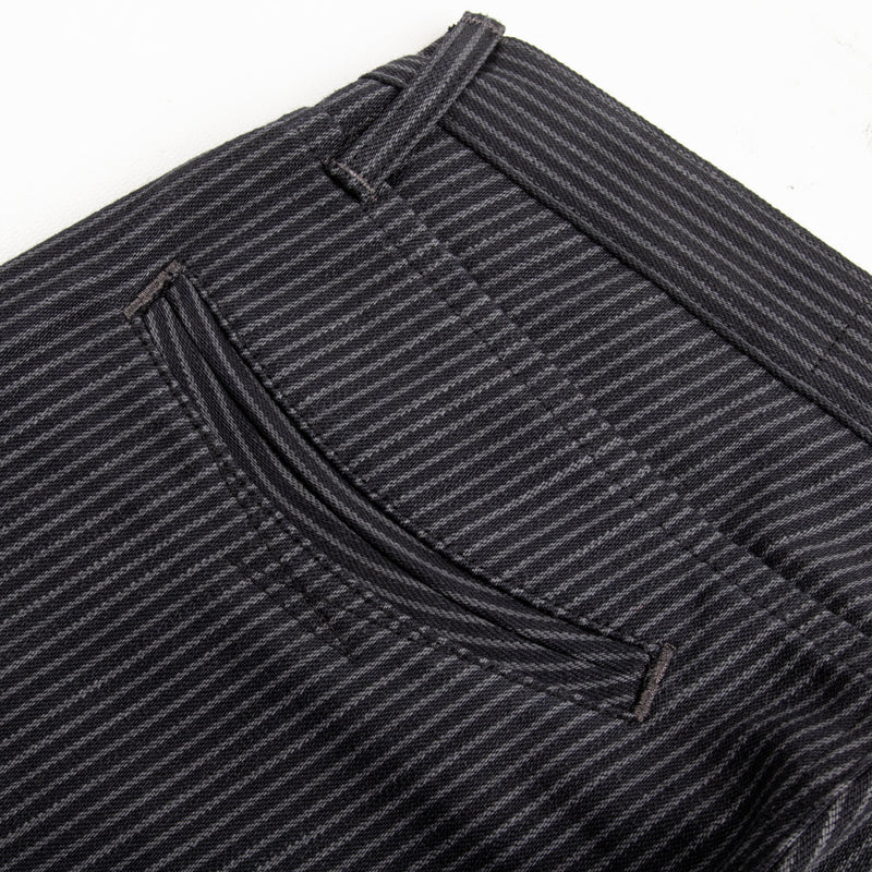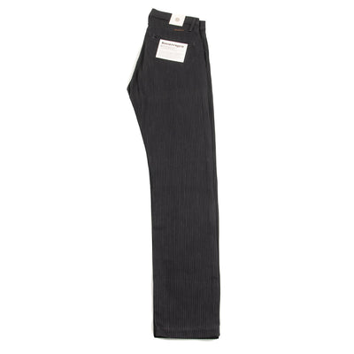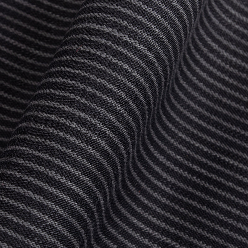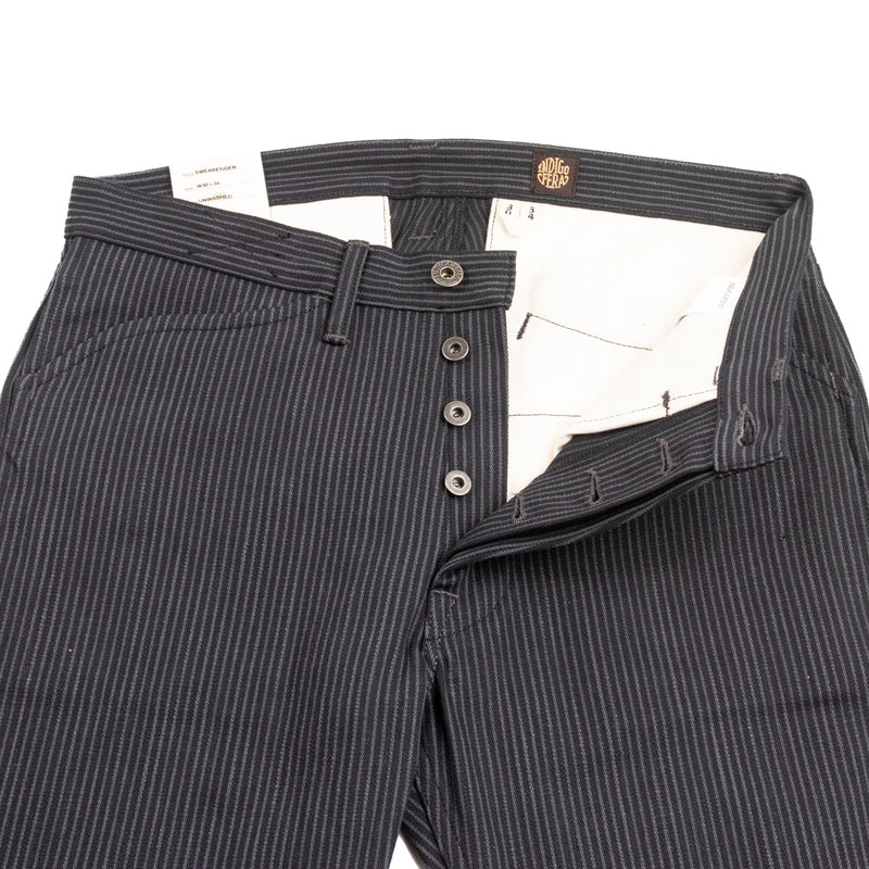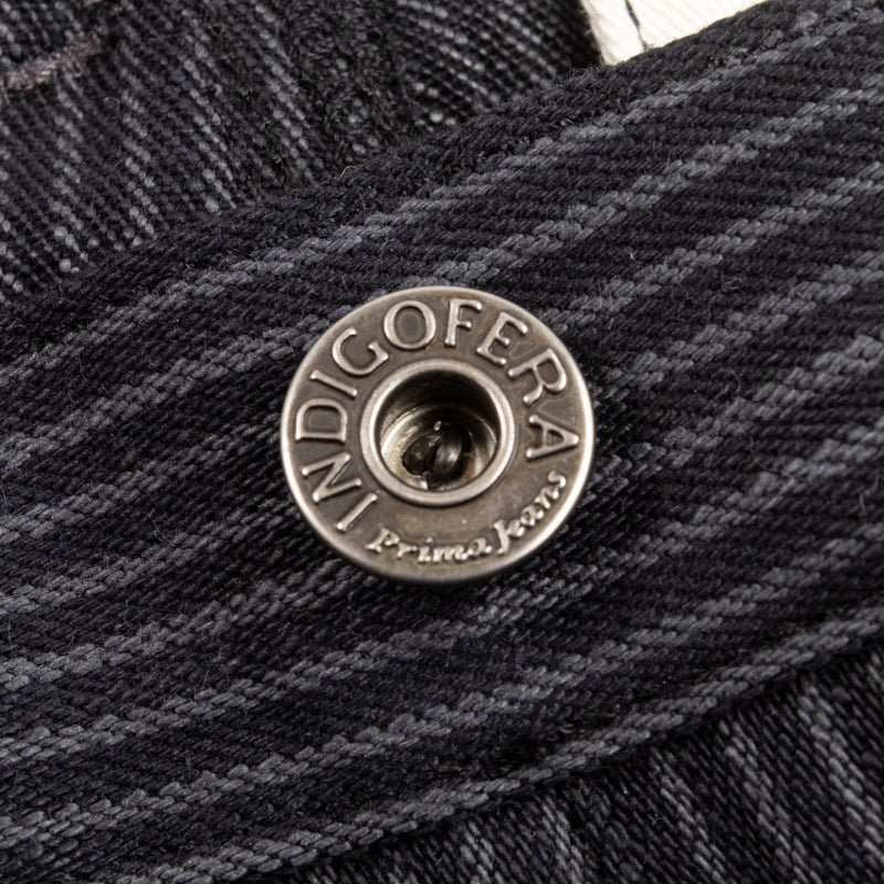 The most recognizable Swearengen fabric is often mistaken for corduroy, but is much closer to denim, in fact. Made from 100% cotton, the gray/black hickory stripe fabric is a 3x1 twill (just like denim) is produced exclusively for Indigofera by Nihon Menpu in Japan. The yarns for the fabric are hank-dyed, rather than the usual rope-dyeing, to lock in the color and significantly slow the fading process over time.