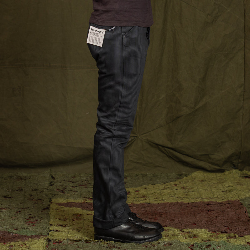 One of our very favorite and best-selling styles of all time, the Swearengen trousers are a surprisingly subtle and inarguable handsome pair of pants. Featuring an old school western style fit, these feature a low mid-rise top block, with fitted thighs and a slim straight fit down to an honest leg opening that should *just* fit over even your thickest boots. Not quite skinny, not quite straight, the fit is a perfect blend of glove-like snugness and a natural drape.