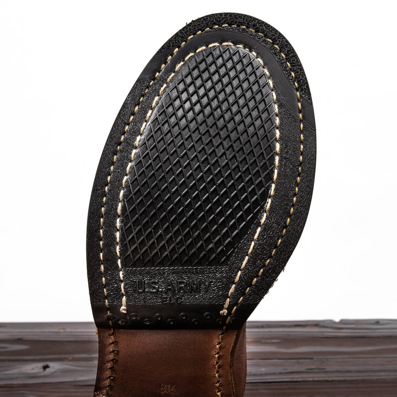 The last that these boots are built around was created by taking mold from an original WWII pair, then fine-tuned to produce an elegant silhouette while staying true to the original. The uppers are a veg-tanned horsehide, with a full leather lining. They're Goodyear-welted with a UK-made storm welt for maximum weatherproofing. The soles are a custom Japanese-made reproduction of the original WWII US Army chequered patterned soles. Woven shuttle-loomed labels finish off the boot.