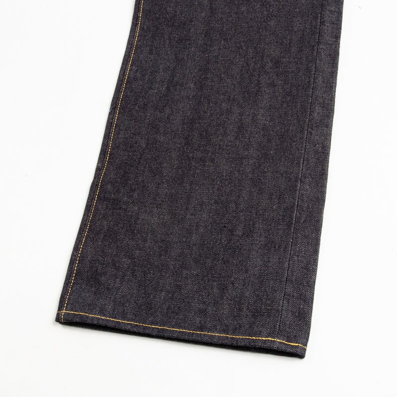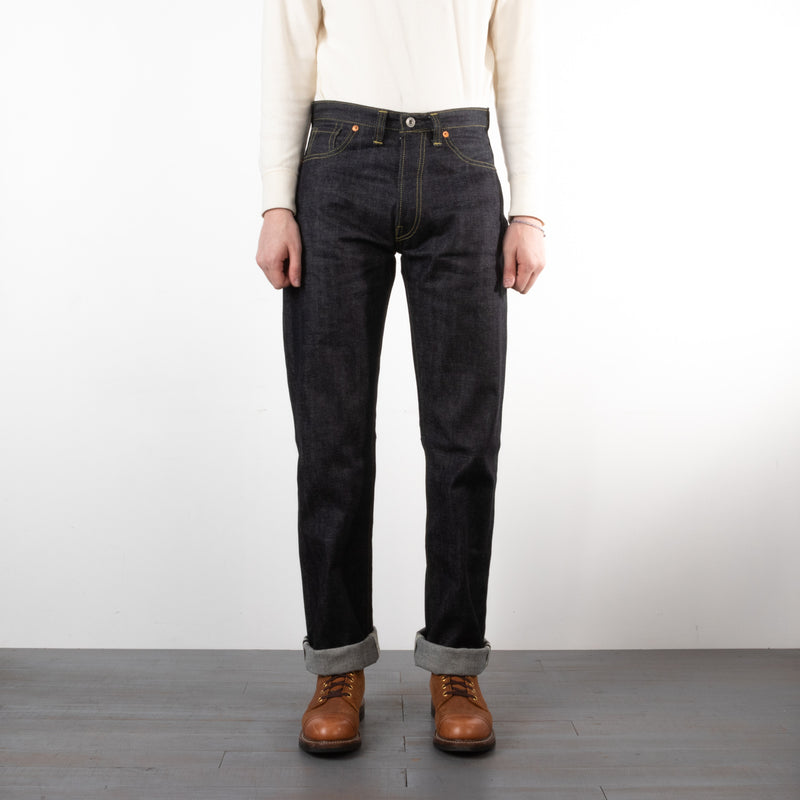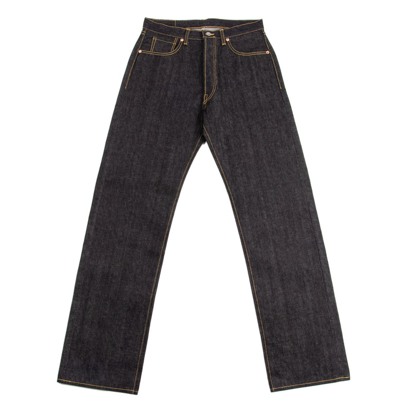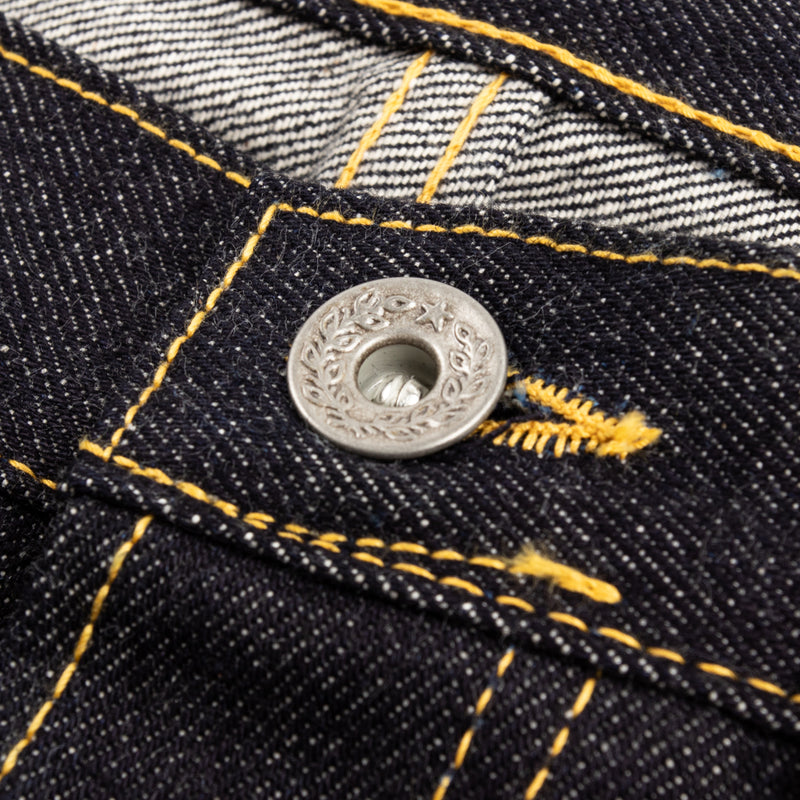 Lot S003 from The Real McCoy's captures the essence of these jeans while sewing to their high standards. The denim is a custom 14.5oz unsanforized denim developed specifically for this jean. The stitching on the waistband, belt loops, and pockets is irregular on purpose to replicate the originals; and the pocket bags and fly are not finished off for the same reason.