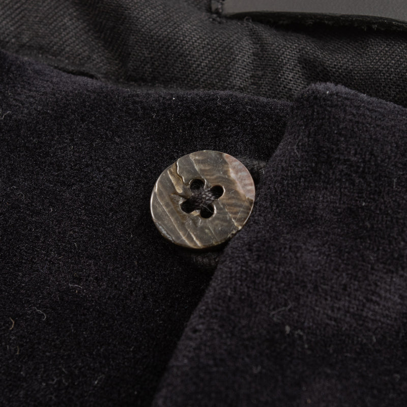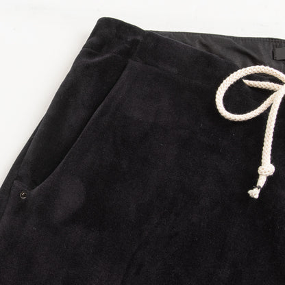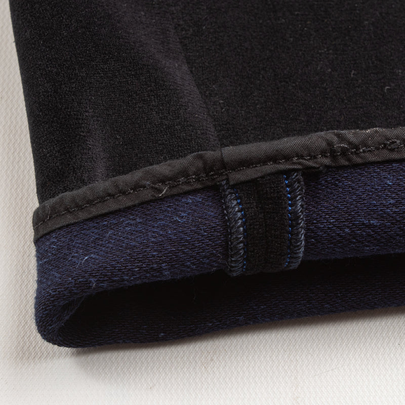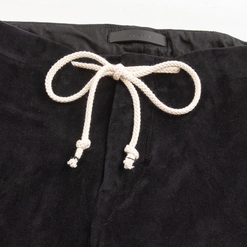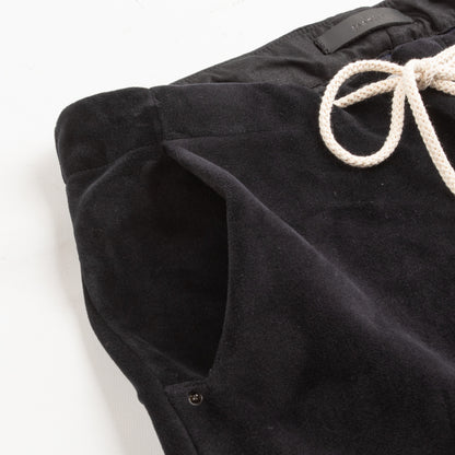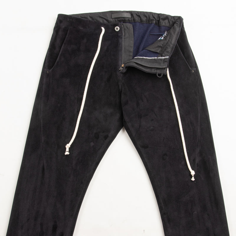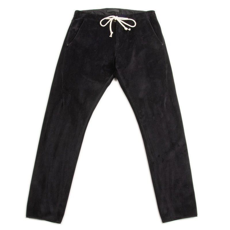The fabric is the detail to pay attention to here: an indigo velour poly/cotton velvet, with an all-black outer face and pigment dyed indigo inner face. Extremely soft and comfortable, it's the ideal fabric for an opulent easy-pant like these. Be aware that the pigment-dyed indigo interior can potentially crock on other garments in certain conditions.