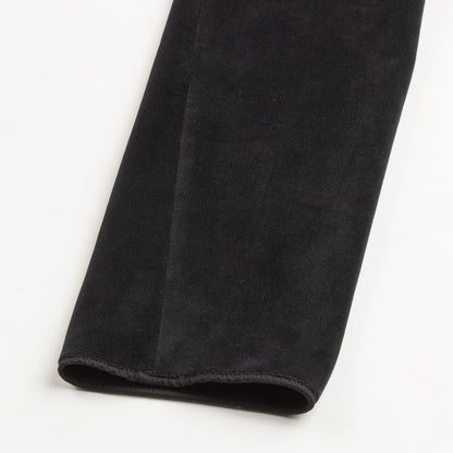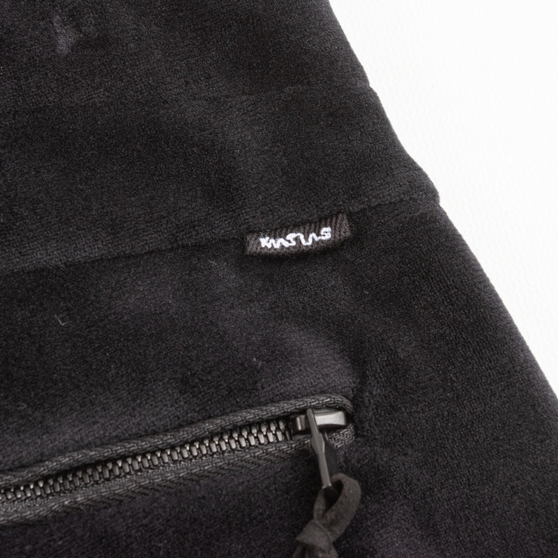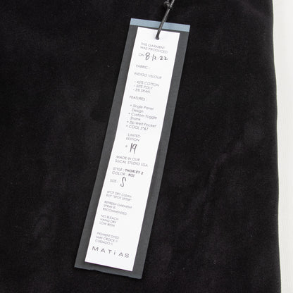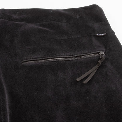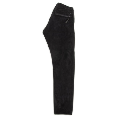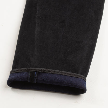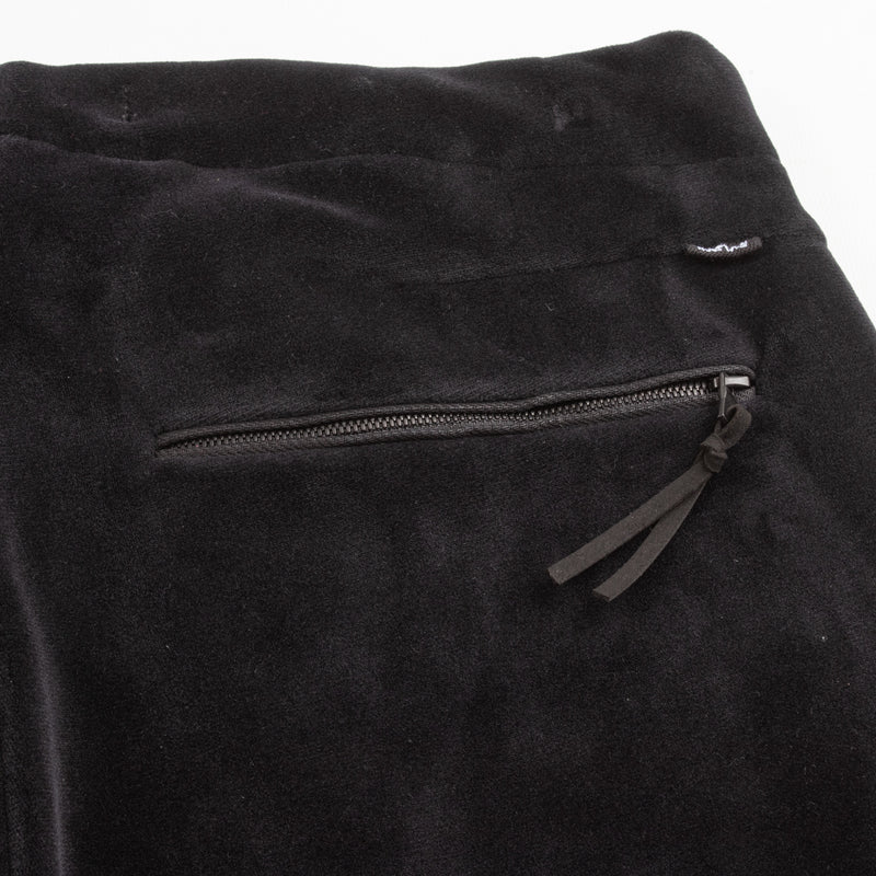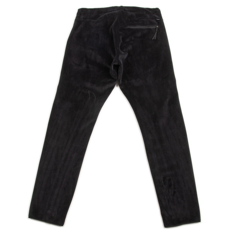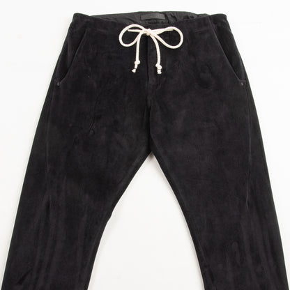 The fabric is the detail to pay attention to here: an indigo velour poly/cotton velvet, with an all-black outer face and pigment dyed indigo inner face. Extremely soft and comfortable, it's the ideal fabric for an opulent easy-pant like these. Be aware that the pigment-dyed indigo interior can potentially crock on other garments in certain conditions.