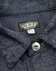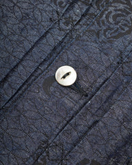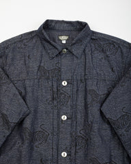 It's made from a lightweight (5.5oz) cotton/linen chambray fabric with a ton of detail. Featuring a jacquard design that depicts tigers, clouds, and the crescent moon — inspired by antique Ikat patterns woven between the Edo period and Meji era in Japan. The warp yarns are made from 100% American cotton, and feature an indigo rope-dyed finish to grant them a dark denim finish that will continue to face over time. The weft uses premium European linen, with a slightly more consistent and lustrous black color.