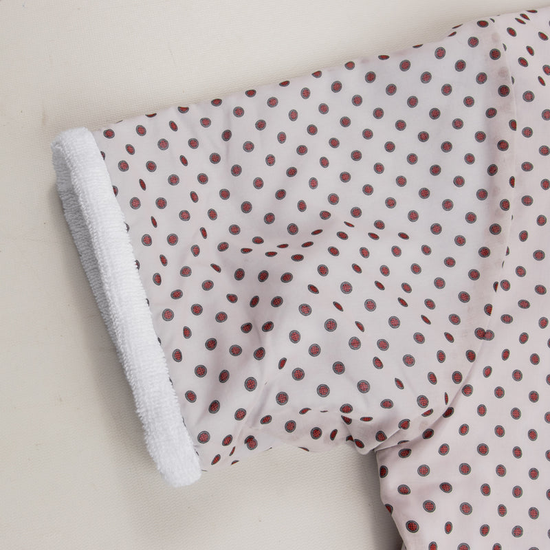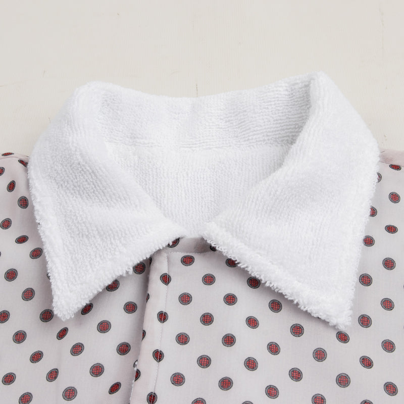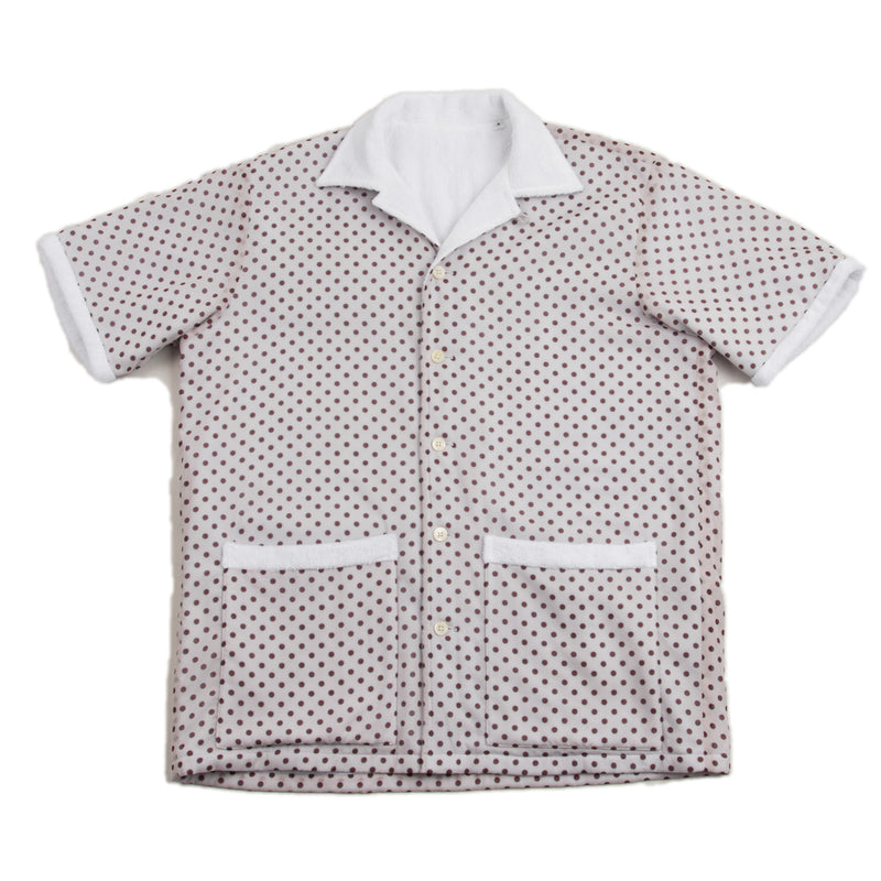 Bryceland's have sewn their towel shirts up in a double-face configuration, using a lightweight vintage French voile fabric with retro prints as the outer face, and an extremely soft 100% cotton French terry cloth for the inner. Terry cloth, recognized by it's multitude of tiny loops, is the same fabric used to make towels, and its invention popularized bathing throughout Europe in the mid 1800s.