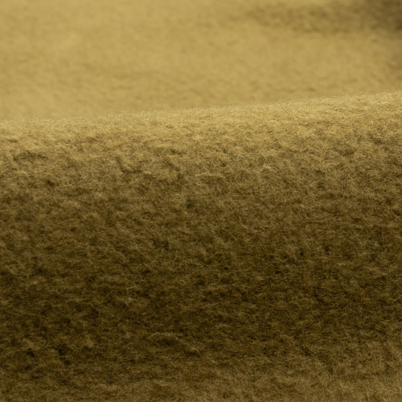 The fabric is a custom cotton/acrylic blend fleece, that utilizes the softness and comfort of cotton as well as the durability and insulation of the added acrylic. Intensely soft and comfortable, the fabric will pill as the nap of the fleece patinas from a tight, fuzzy texture to a more uneven, furry one, becoming even softer with washing and wear.