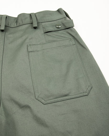 They're made from a 100% cotton sateen cloth in a "sage green", which was the color used to distinguish "grease monkeys" (mechanics) from the fatigues of other personnel. It's tightly-woven and soft, with a comfortable structure and a very subtle shine to its surface. Over time it will relax and soften considerably, stretching out slightly and forming set creases and fading slightly from wear.