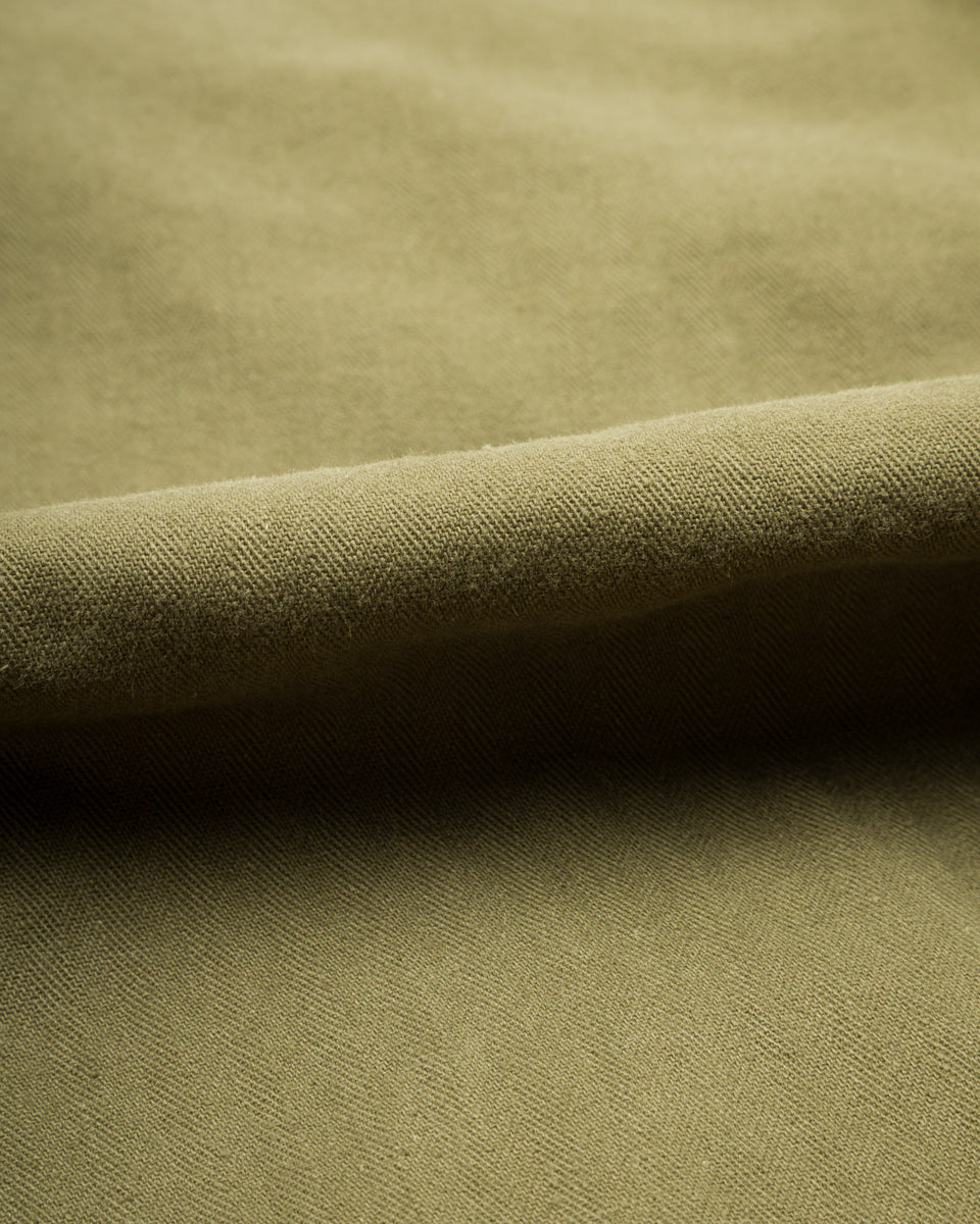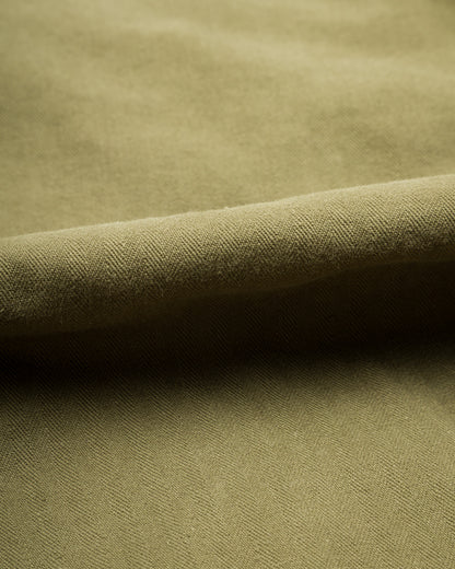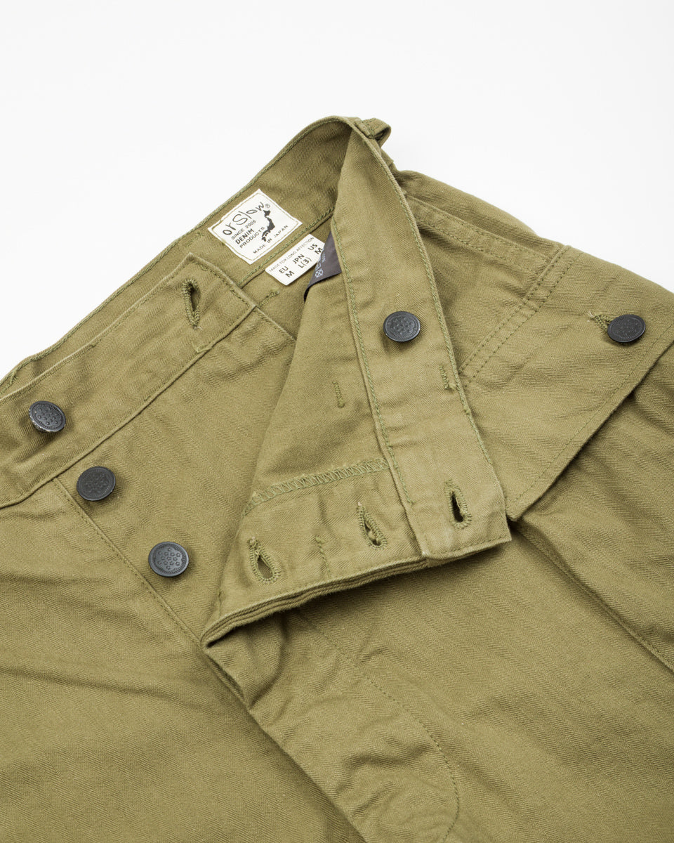The fabric this time around is an army green 100% cotton HBT - lightweight and comfortable, it breathes well in warmer weather, and will age and wear in just like the originals. Keeping with the military theme, these use gunmetal repro buttons throughout that will patinate authentically over time.