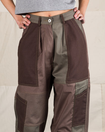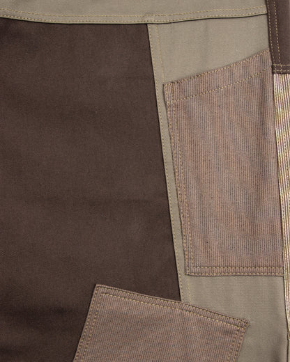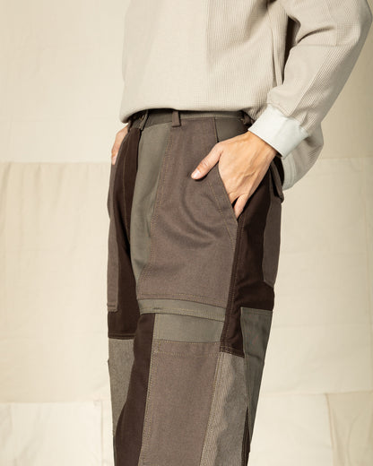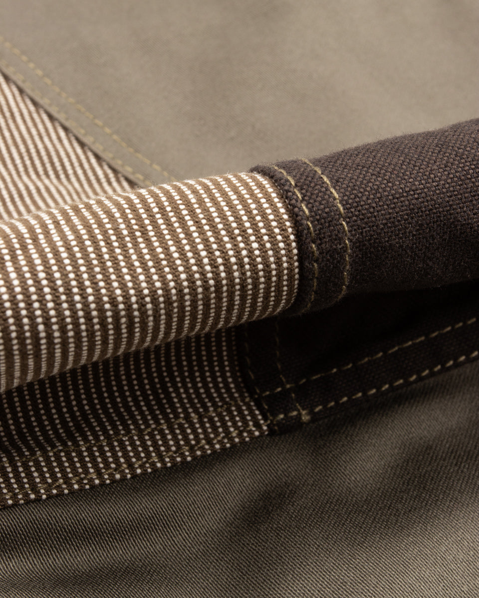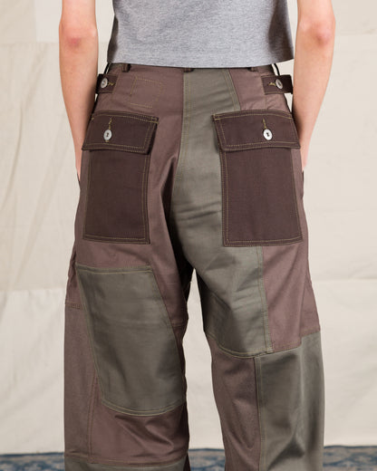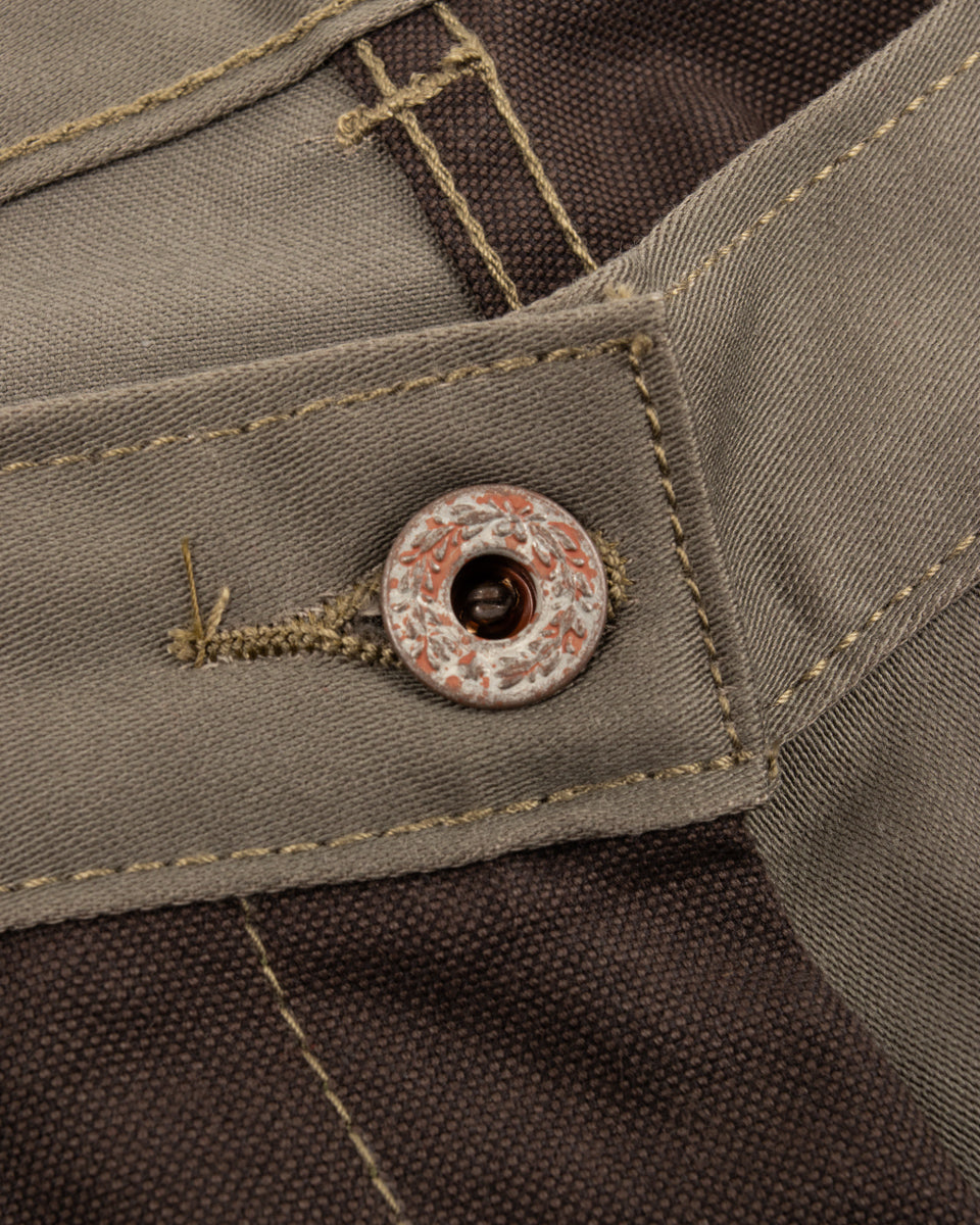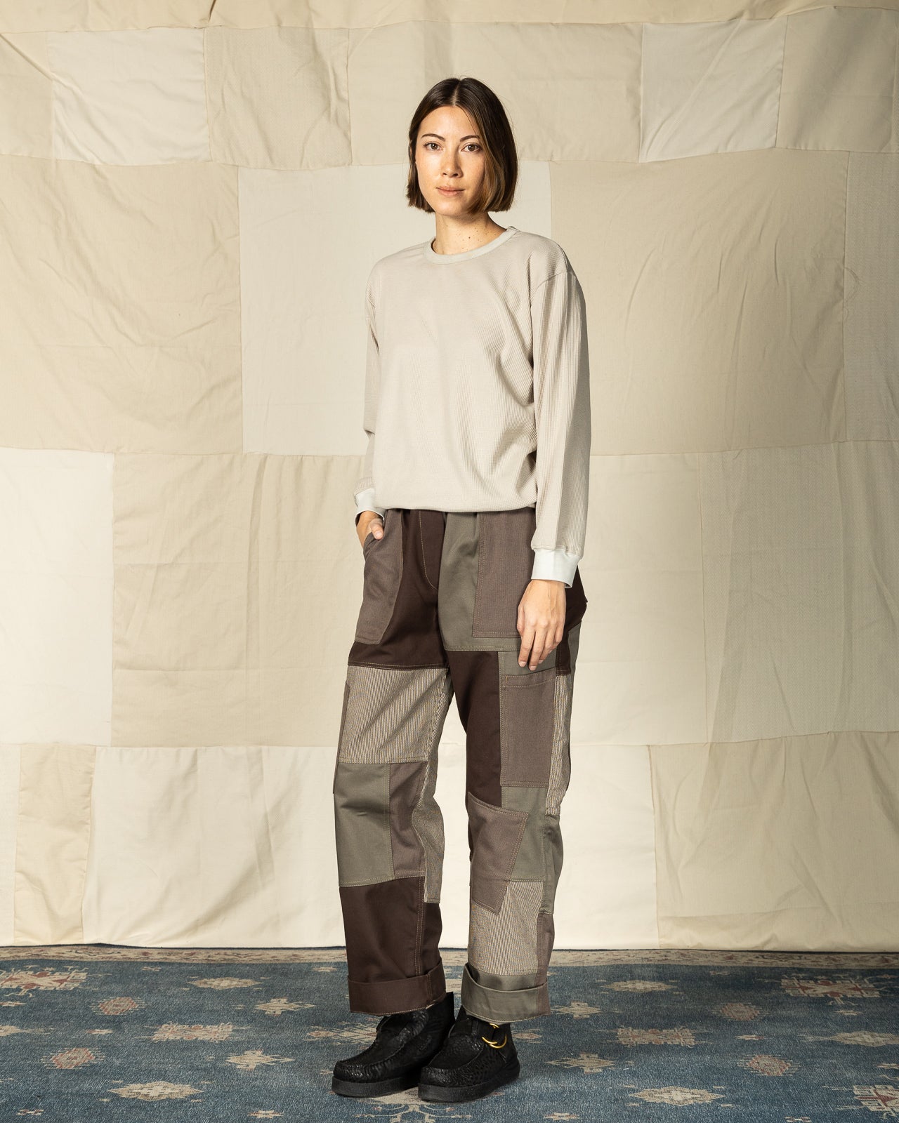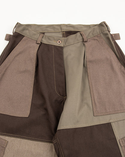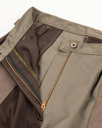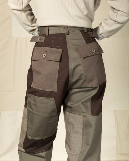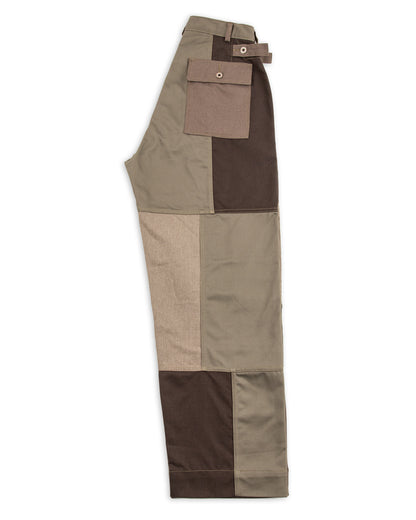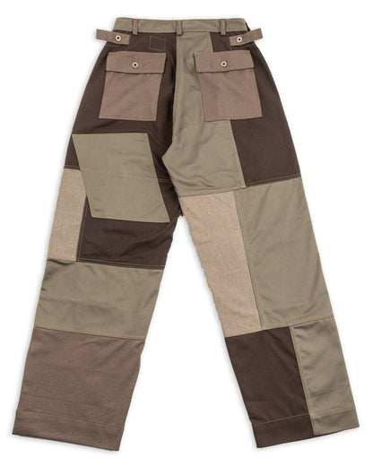 Completed with a clean interior construction and fully finished seams, these are built to last, utilizing double stitched felled seams throughout. The patchwork is comprised of several olive green, khaki, and military fabrics - these are new-old-stock, and made from off-cuts and scraps that would otherwise be thrown out. Instead, these perfectly new and exceptionally high quality fabrics are fully utilized, creating a pair of pants that are (in our opinion) both artistically valuable and functionally superior.