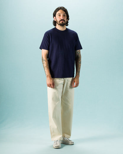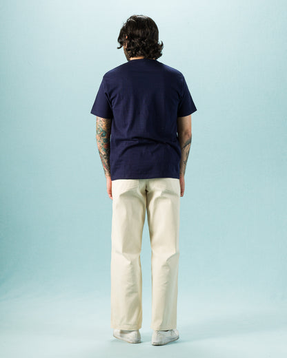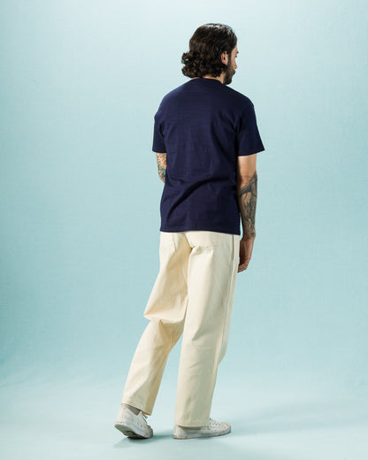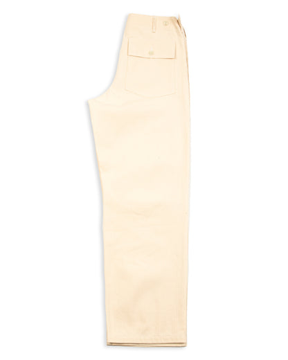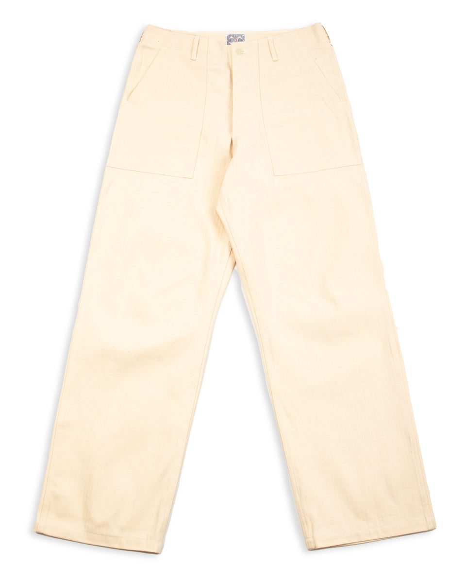 The fit is classic, with a medium high rise and a very-slightly-tapered (but basically straight) leg that looks flattering on almost anyone. The fabric promises to age beautifully, softening considerably and developing creases as it breaks in from wear and washing. Like any herringbone, it'll develop a more fluid drape over time, taking the shape of the wearer and moving with them, becoming better and better the more you wear it. The natural color choice (as opposed to the usual olive green) is inspired by chef's uniforms.