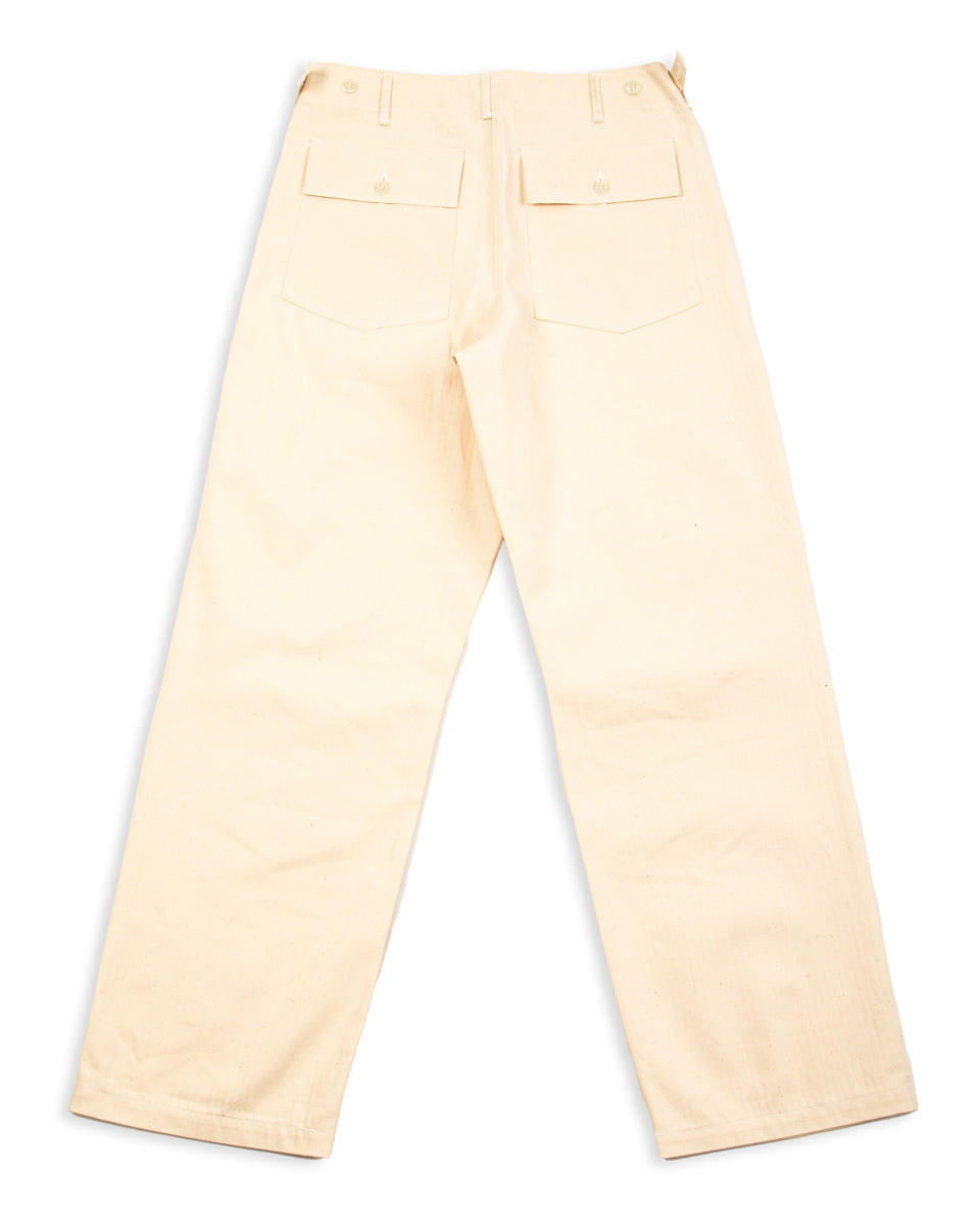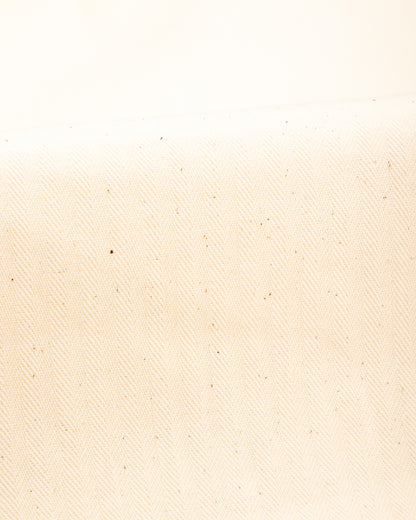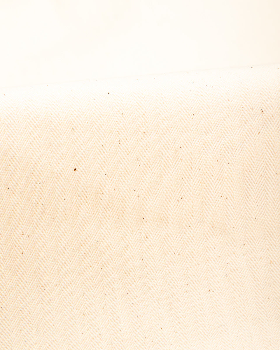 Said fabric is a completely raw and undyed cotton herringbone in a natural ecru, complete with flecks and neps leftover from the processes of turning raw cotton into yarn, and then that yarn into fabric. As a raw cotton, it's expected to shrink a bit after a wash, and will then stretch out again with some wear. In general, it's better to size up, because the waistband features side-tab adjusters that can help bring in the fit, and it's always better for things to be a bit too big than too small — something raw not shrinking enough is always preferable than if it shrank too much.