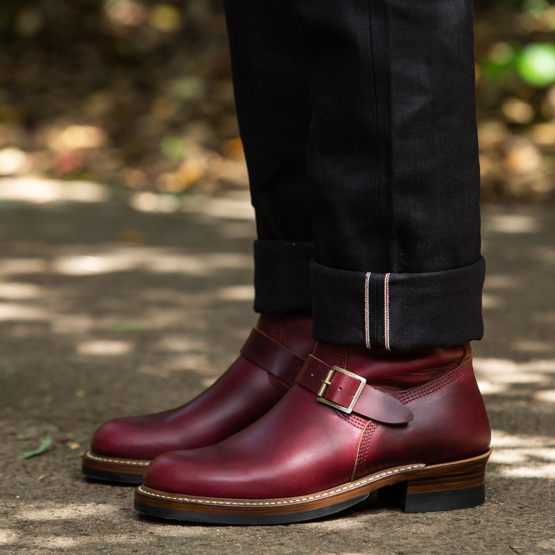 Chromexcel cowhide an extremely sturdy and handsome leather that only gets better and better with time. Burgundy CXL is a tea-core leather that will darken over time and scuff to brown with wear. It also has a pronounced pull-up effect, meaning that when the leather is stretched or under tension, it will appear lighter in color, leading to a variation in shade across the different panels of the boot. It comes alive in direct sunlight, where the various tonal highs and lows of the deep red leather become most most visible.