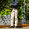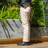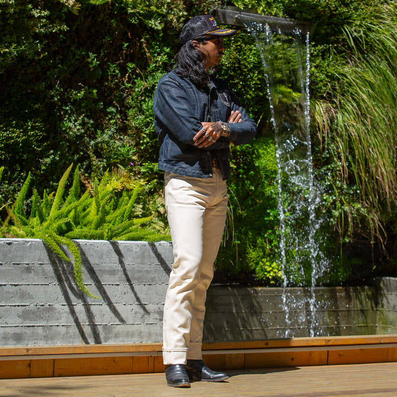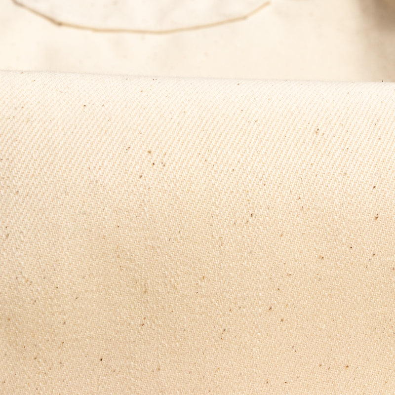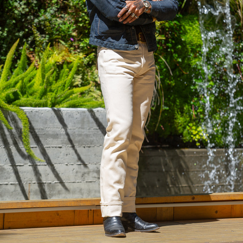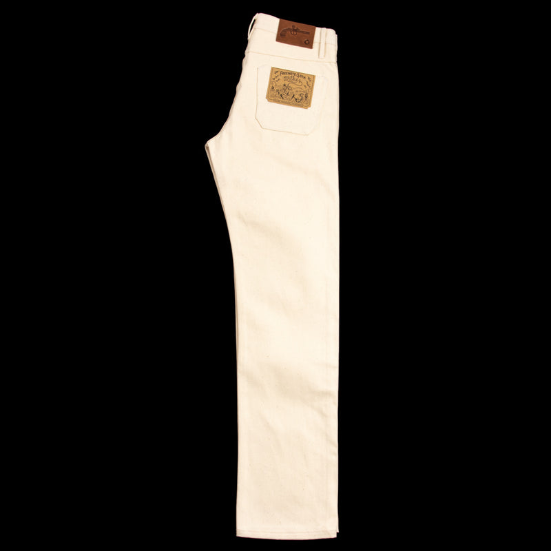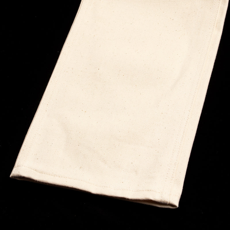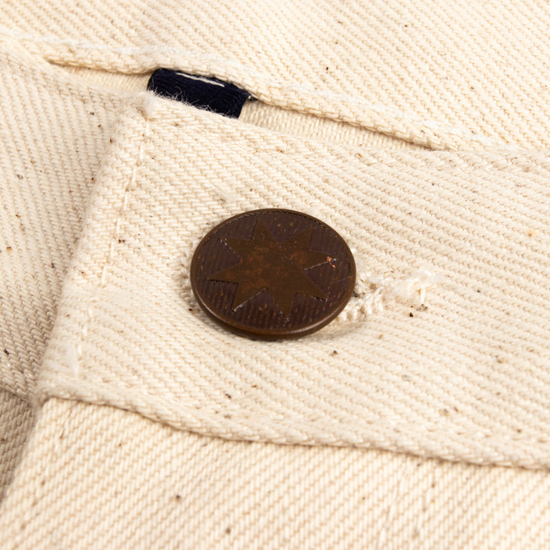 These are sewn up from a "natural" ecru denim sourced from Japan. This 100% cotton fabric is a warm off-white color, with dark brown neps present throughout. Clocking in at 14oz, it's a respectable midweight, the kind of denim that needs a bit of a break in - but becomes unbelievably comfortable afterwards. As these are undyed, the fabric won't fade, instead gaining a patina over time from whatever you do while wearing them. Embrace it.