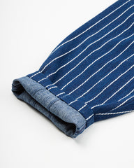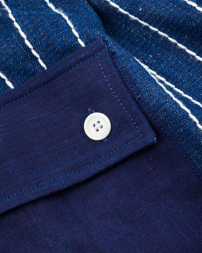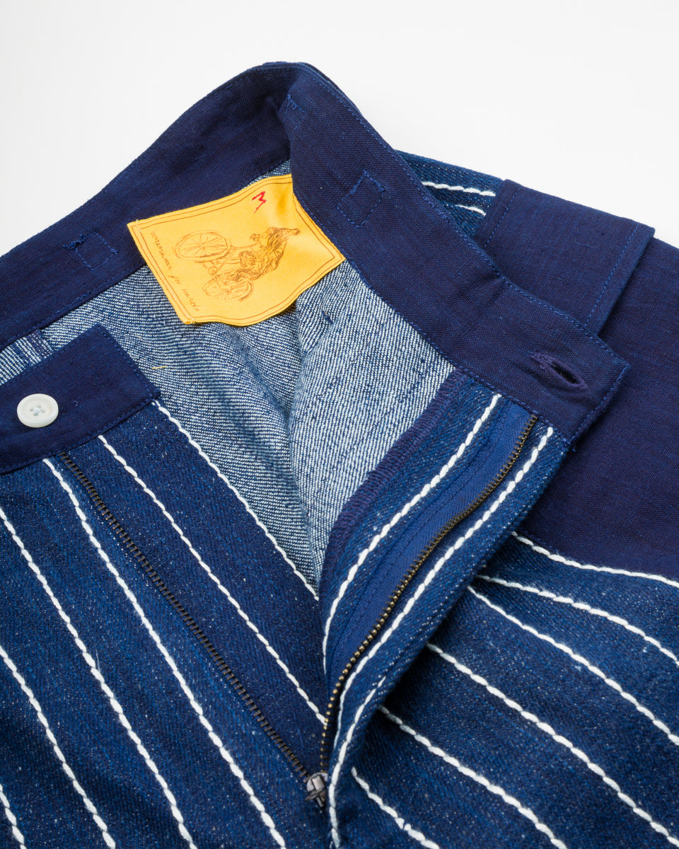 They're made from a hand-loomed, 100% cotton, 3x1 denim fabric with white Kantha topstitching and Khadi fabric trims. Khadi is a traditional Indian cloth made from handspun yarn and then naturally dyed (or left undyed and unbleached). In this case, both the denim body and Khadi trims are colored with natural indigo, and will gradually fade over time as a result of wear and washing.
