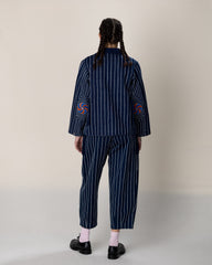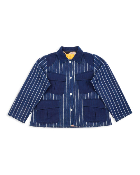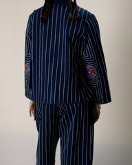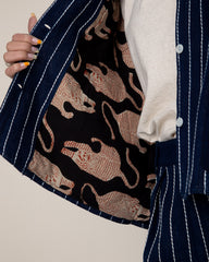 The 100% cotton lining features a custom tiger print design, and the elbows are reinforced with circular embroidery and additional Kantha stitching. There are brass eyelet vents on the back of the arms for comfortable ventilation, and the front placket closes up with four custom Kardo buttons.