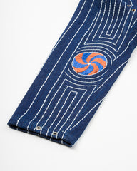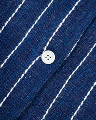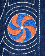 It's made from a hand-loomed, 100% cotton, 3x1 denim fabric with white Kantha topstitching and Khadi fabric trims. Khadi is a traditional Indian cloth made from handspun yarn and then naturally dyed (or left undyed and unbleached). In this case, both the denim body and Khadi trims are colored with natural indigo, and will gradually fade over time as a result of wear and washing.