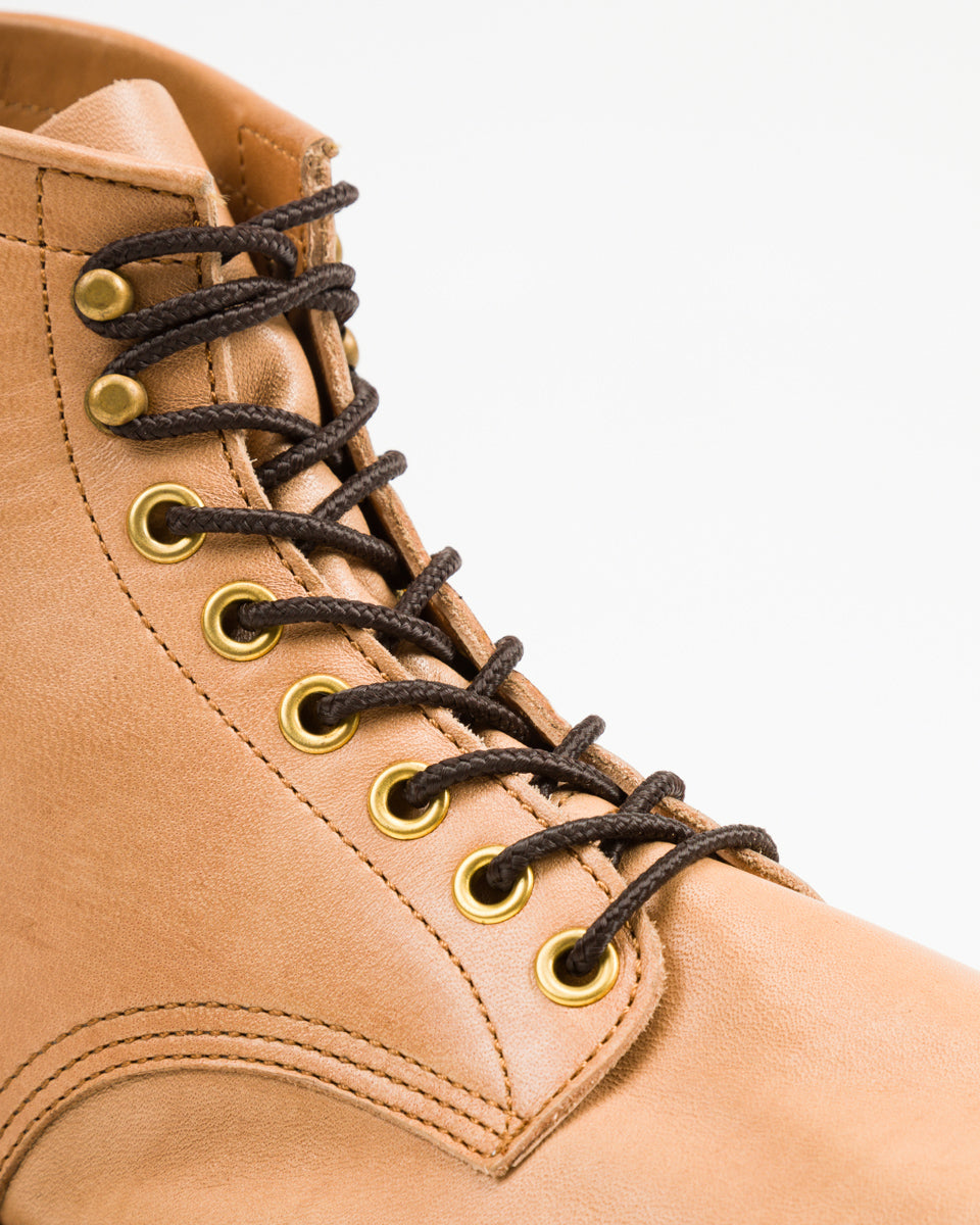Outside of that, these are a classic and handsome heritage style boot, with a rounded and unstructured toe, 270 degree storm welt, and polished brass hardware. They stand on our favorite, the Vibram 705 half sole & heel combo - a world class pairing in terms of traction, durability, and sleekness.