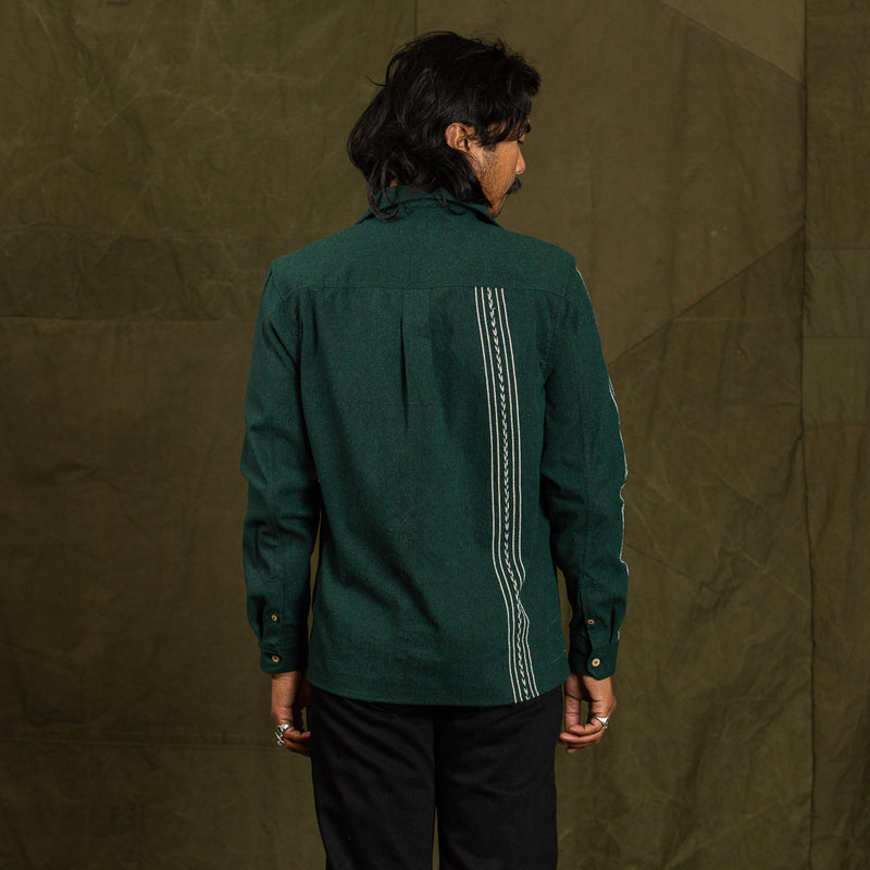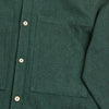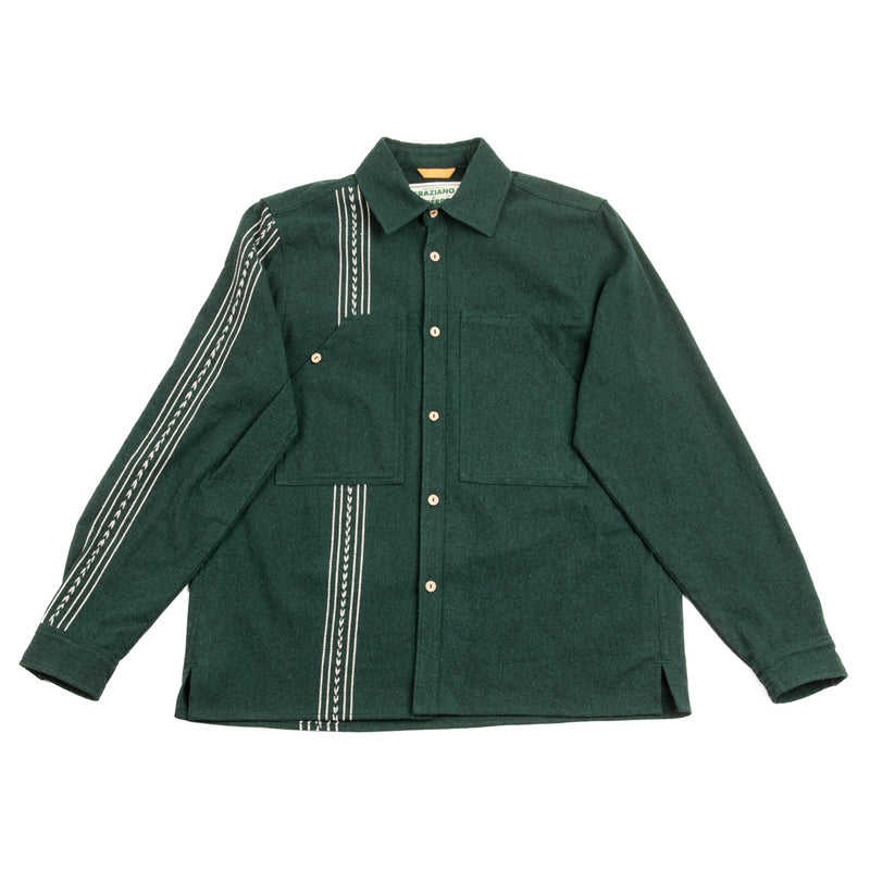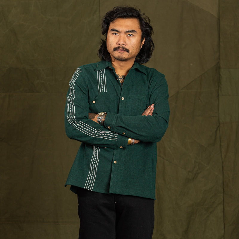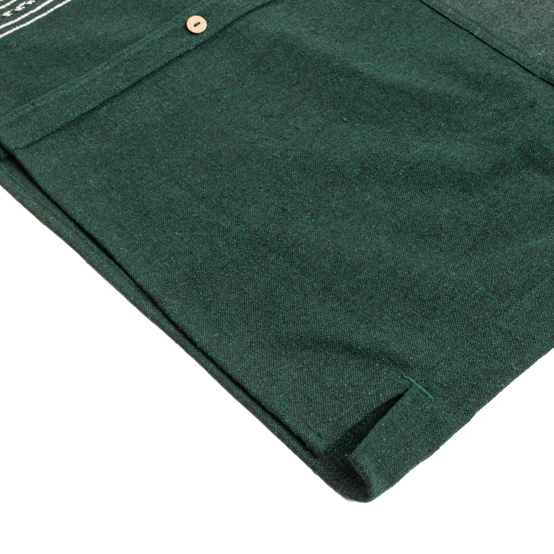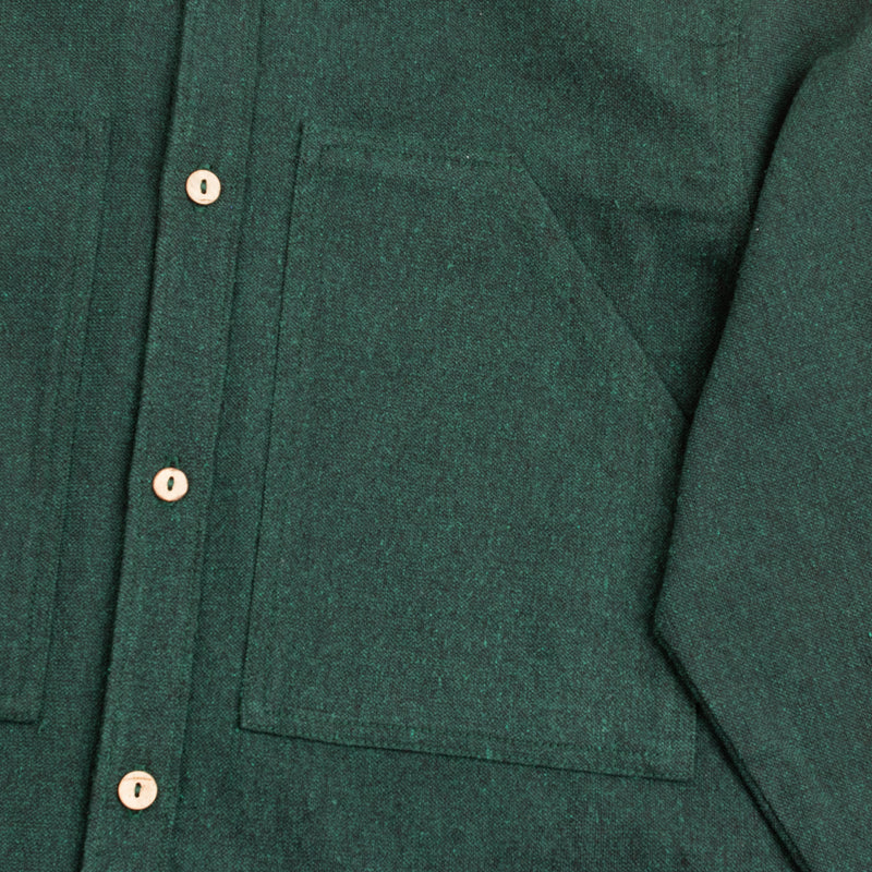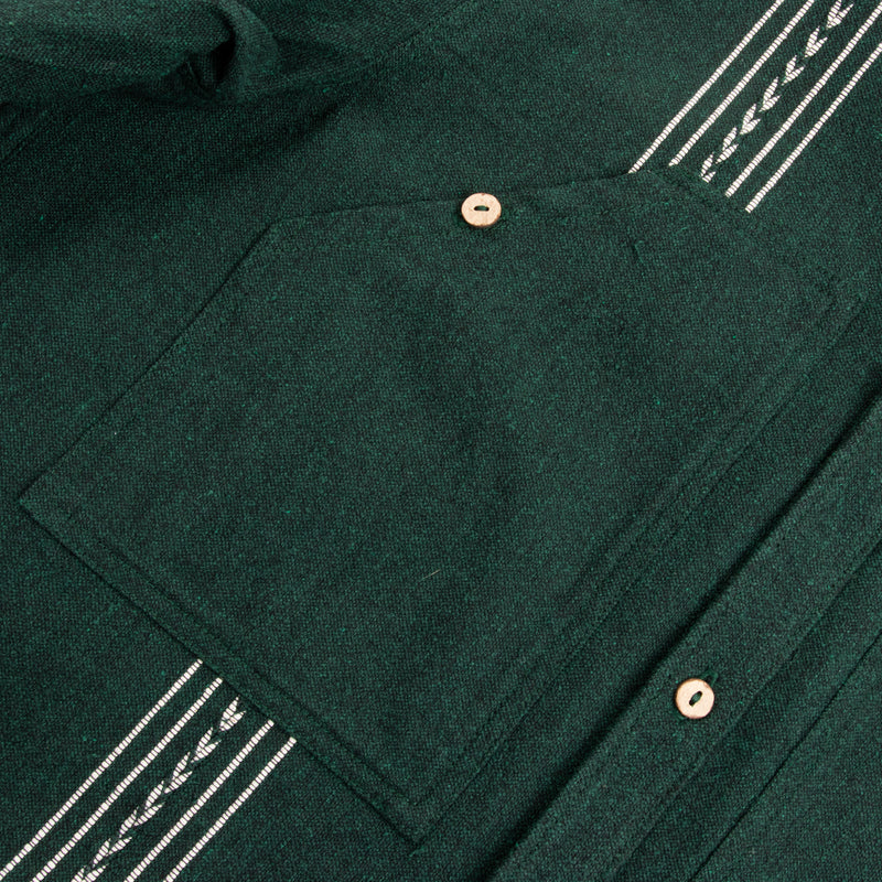 The Work Shirt is made from a pedal-loom woven, green striped cotton fabric - with two patch chest pockets, a relaxed collar, and undyed coconut buttons. The fabric is a comfortable medium weight with a slightly brushed hand, and was made by Familia Bautista Martinez in Teotitlan del Valle, Oaxaca before being sewn into a shirt in Portland, Oregon by Alejandro Gutiérrez.